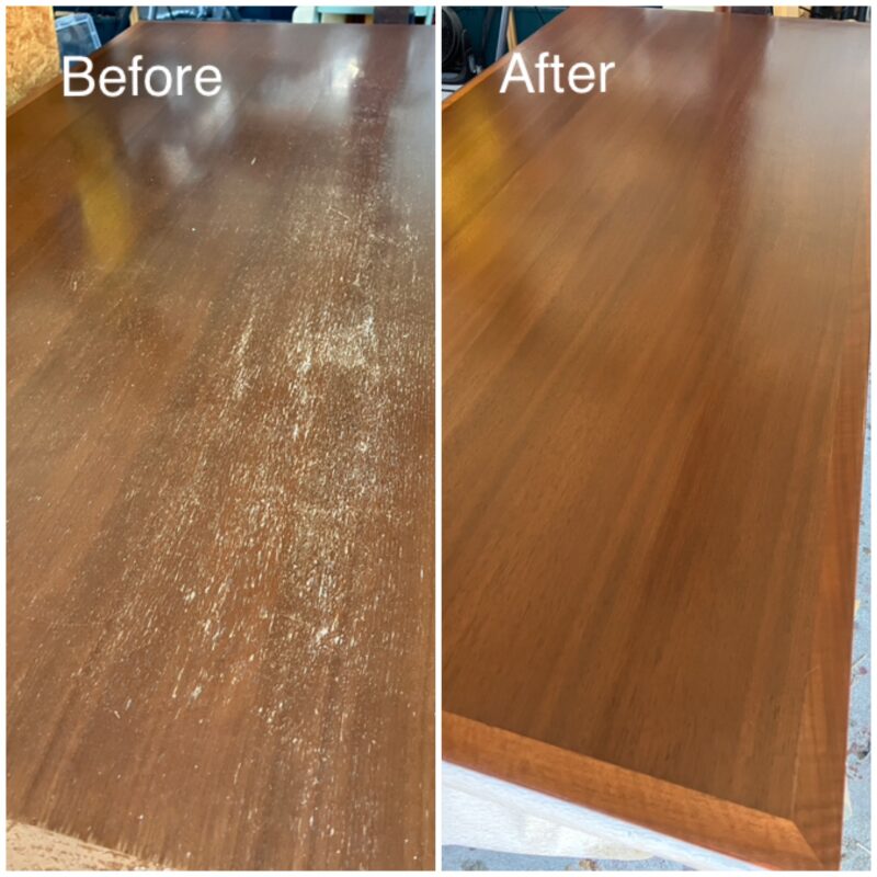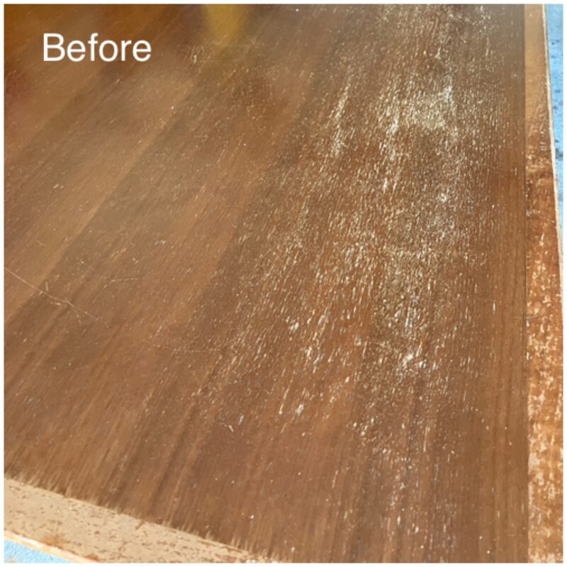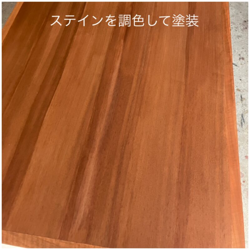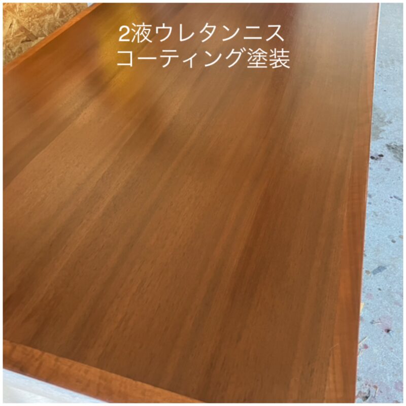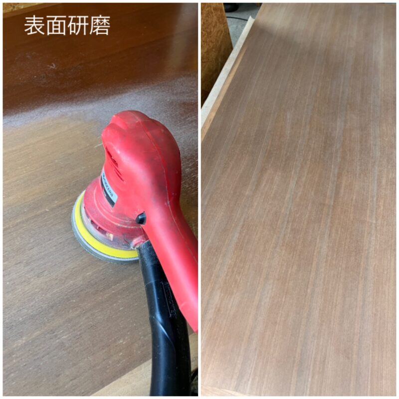 購入されて15年ほどのダイニングテーブル。経年劣化で表面のコーティングや色が剥がれておりました。天板のみ持ち帰らせていただき、丁寧に表面研磨したあと、ステインを調色してオリジナルの雰囲気に合わせて塗装しました。仕上げは2液硬化型のウレタンニスを塗装しました。ダイニングテーブルですので、100℃耐熱仕様のウレタンニスを使用し、熱いものを置いても大丈夫なようにしました。お客様から、仕上がりを見て「新品みたいですね」と喜ばれまして、私も非常にうれしいです。これからも長くお使いくださいませ。