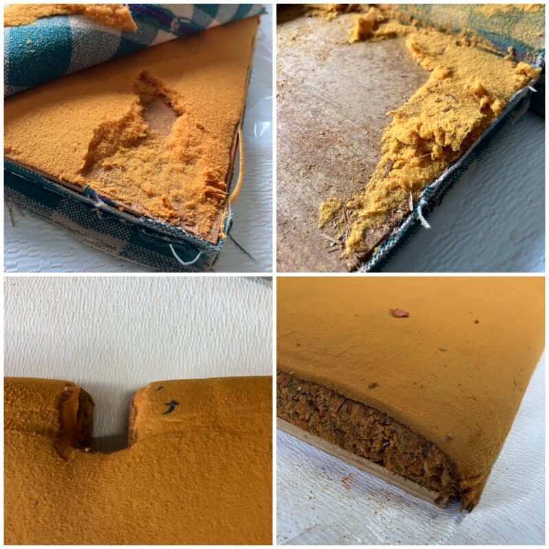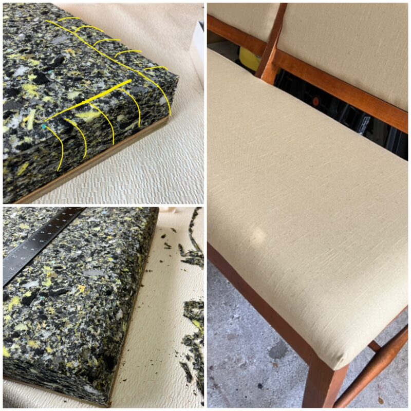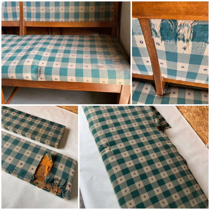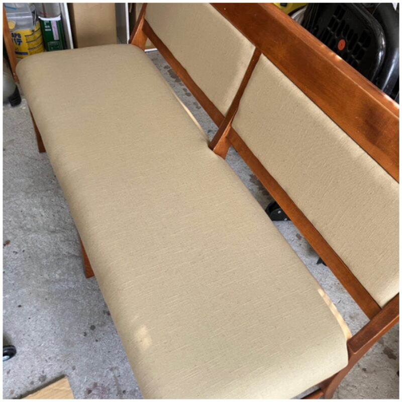 かなり古い長椅子のスポンジと生地を張り替えました。スポンジは経年劣化が進み、ウレタンがパウダー化していました。またおそらく猫のおしっこ攻撃で尿臭がひどく、木材部以外はすべて交換です。やっかいなのは金属ステーブル(生地等の留め具)で、これを完全に除去するのに、かなりの時間がかかりました。また、生地を張り替えるためには、木枠に合うように縫製が必要ですので、業務用ミシンを使って丁寧に仕上げました。スポンジはアールRをつけるようにカット成形しました。最後にウレタンスポンジと生地をステーブルで留めて、仕上がりです。 新居にてご使用の予定で、仕上がりを喜ばれていました。新しい家具を購入するのではなく、思い入れのある家具をリペアして使っていただけるということで、私も本当にうれしいです。