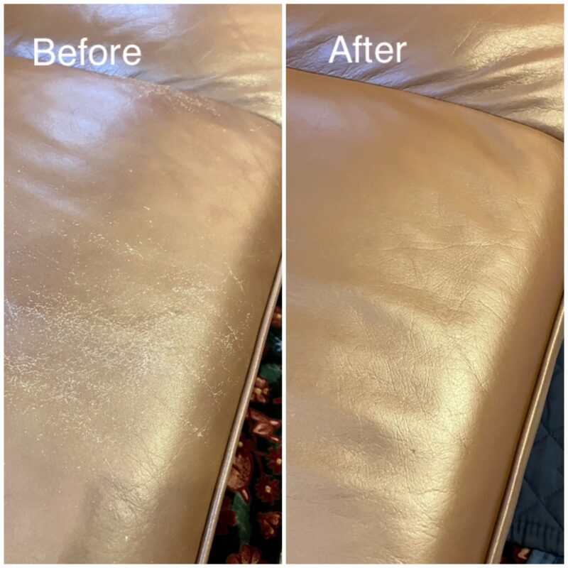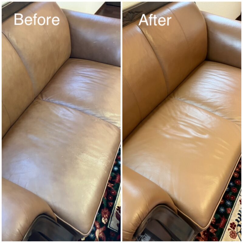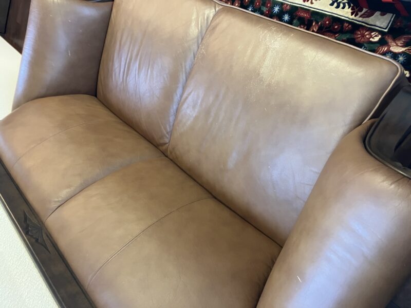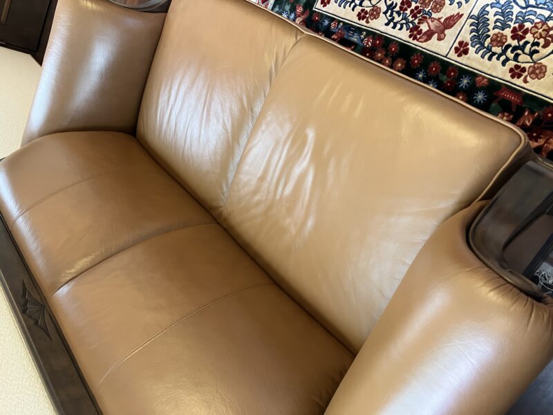 本革ソファ(2人掛け)の補修です。よくお座りになる部分が擦れていたり、飼い猫の爪痕があったりと、経年劣化が見受けられる状態でした。お手入れはこれまでしっかりとなされていたと思われ、大きな割れなどはなく、表皮の塗膜を補修させていただきました。ご自宅での補修でしたので、とにかく養生だけはしっかりと行い、椅子周囲に簡易ブースを作成しミストが散らない様に注意して塗装しました。「新品のように綺麗になりましたね」とおっしゃっていただき、大変うれしいです。ご依頼ありがとうございました。