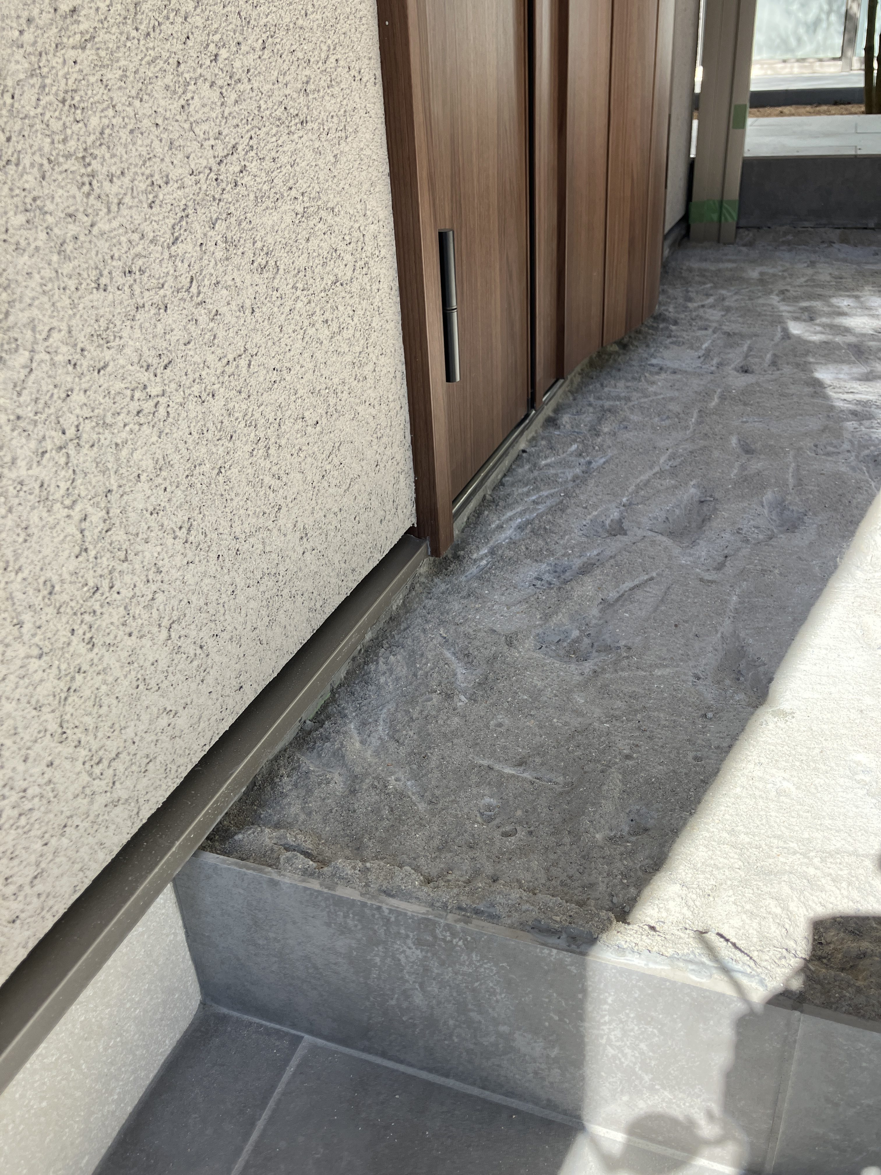 水切りがセメントの硬化遅延剤の影響で変色したみたいです。もう削るしかありませんでした。タイルと水切りとの隙間がほとんどなく、養生に手間取りましたが、綺麗に塗装できました。ご依頼ありがとうございました。