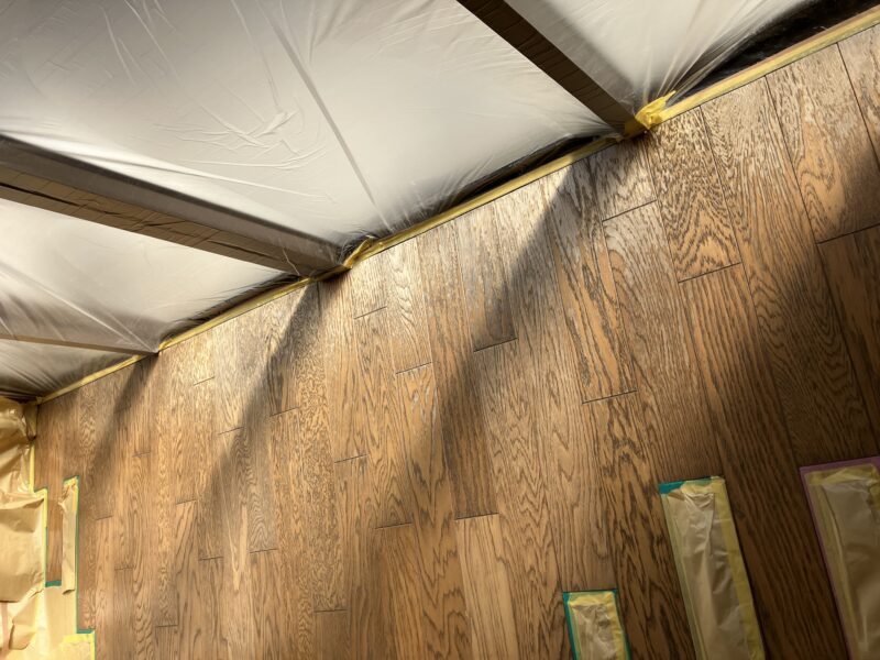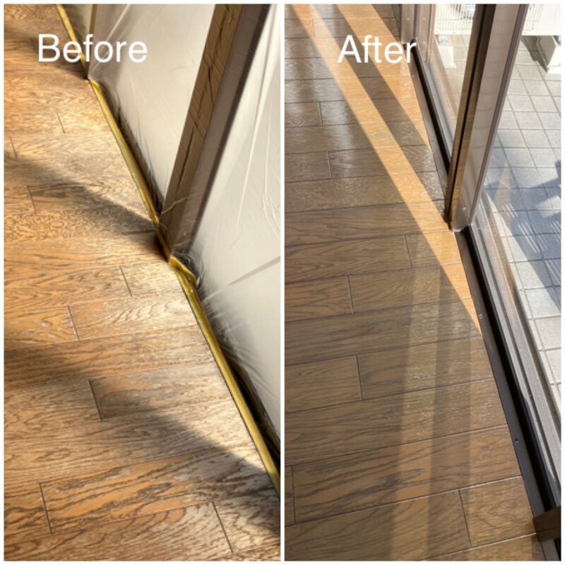 中古住宅リフォームにて、フローリングの掃き出しが広範囲に色褪せしておりました。色褪せのみの劣化状態でしたので、クリーニングしてサンディングで表面を整え、水性塗料で塗装した後、ウレタンコーティングして終了です。まだご入居前だったので、施工環境としてはやりやすかったです。これまで油性塗料をメインにしてきましたが、溶剤臭などの課題もあり、またご在宅での施工もあることから、水溶性の塗料・コーティング剤に切替を始めました。調色の塩梅がまだまだ慣れていないのですが、住環境に無害な施工(お客様にとって、ひいては自分にとって)が大切と思って、継続していきます。