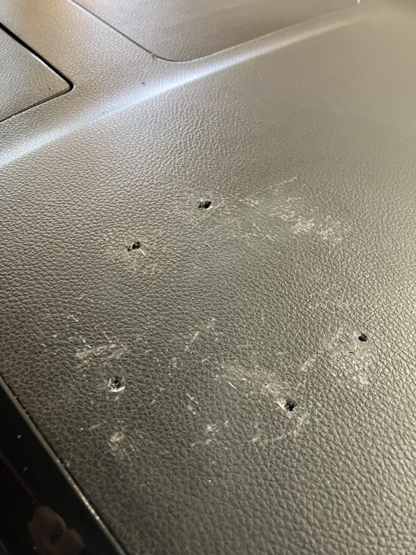 中古車販売業者様からのご依頼で、ダッシュボード(プラスチック製)のビス穴補修です。ポータブルナビ等の設置台をビスで取り付けしていた跡が5つほどありました。このビス穴を埋めて専用塗装した後に、網目状のシボ模様をスプレーガンで再現しました。ハイトなワゴンですとダッシュボード周りが広くて作業しやすかったです。ご依頼ありがとうございました。