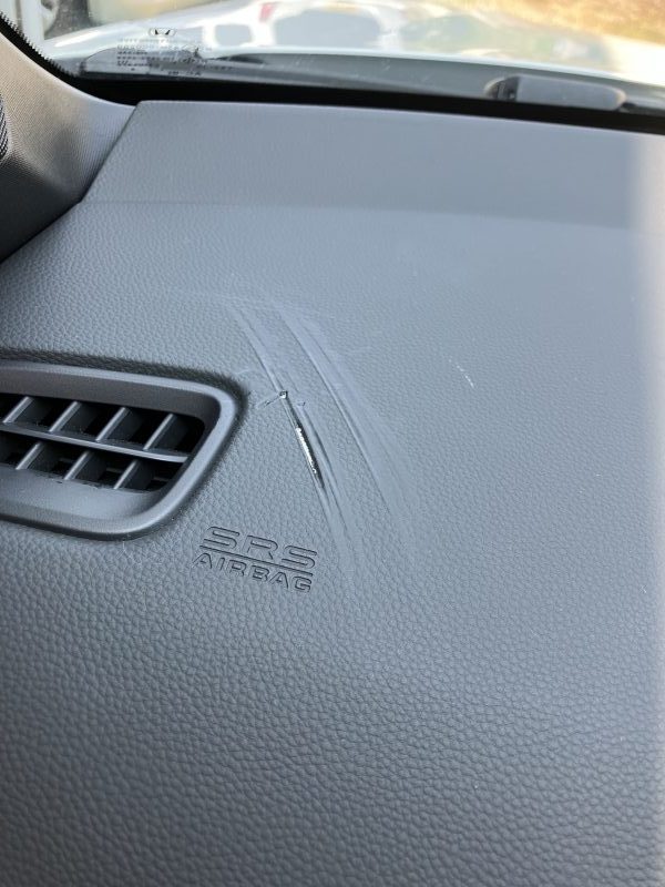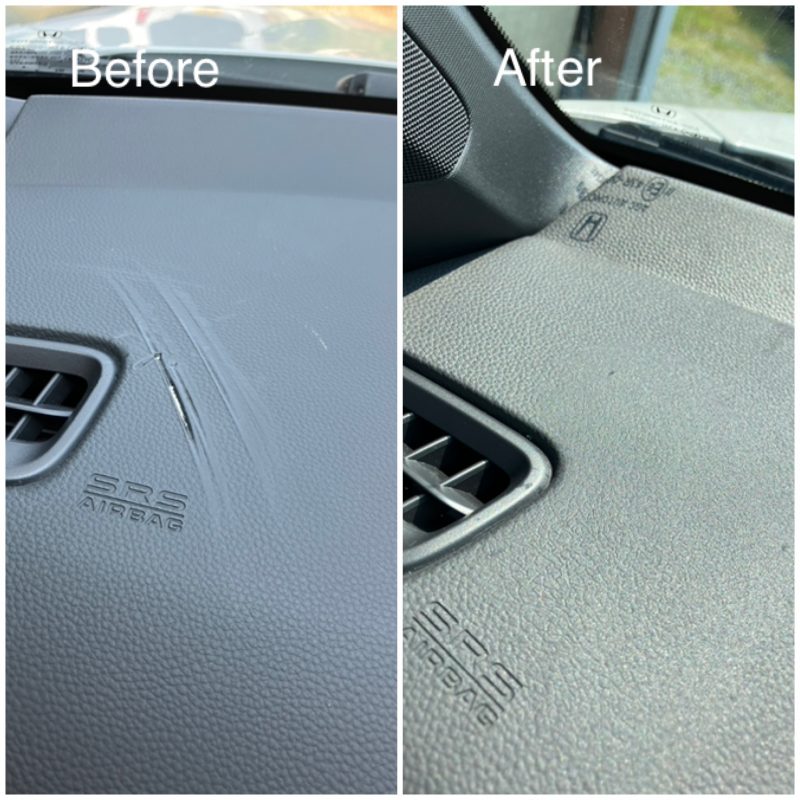 フロントウィンドウに付けていたお守りの吸盤がレンズになって、太陽光の屈折でダッシュボードが溶けて変形したようです。新車購入後1ヶ月でこのようになるのは、ショックですよね。仕上がりにご感嘆いただき嬉しい限りです。ご依頼ありがとうございました。