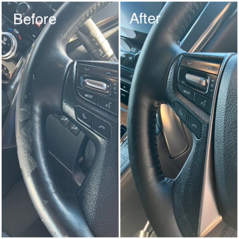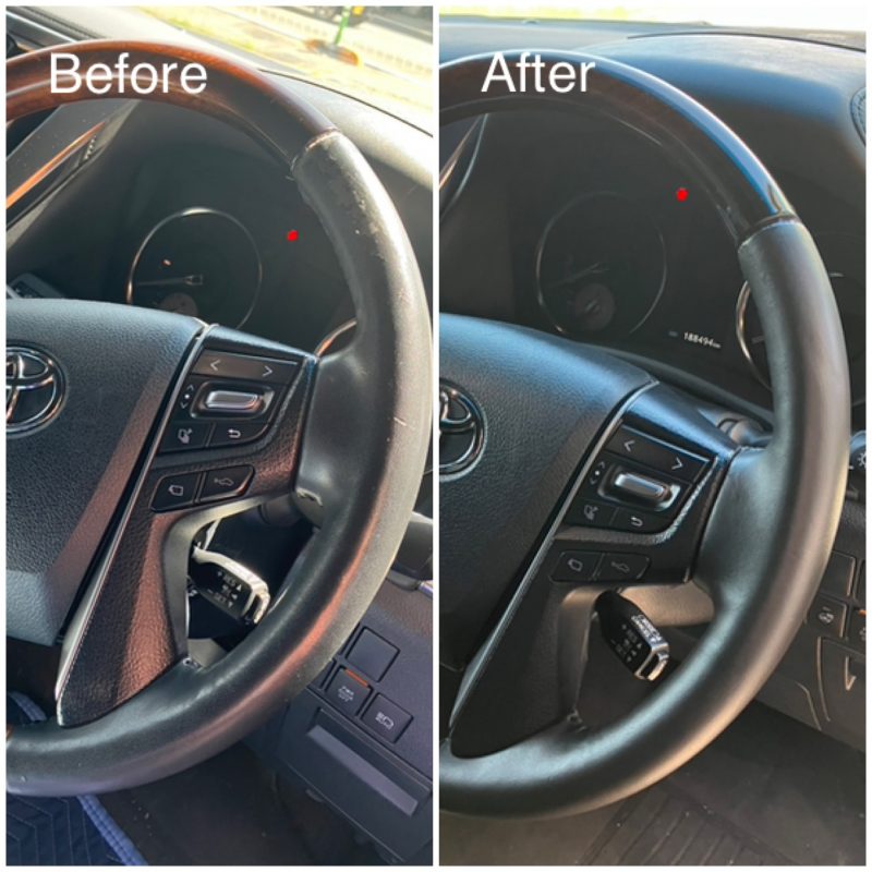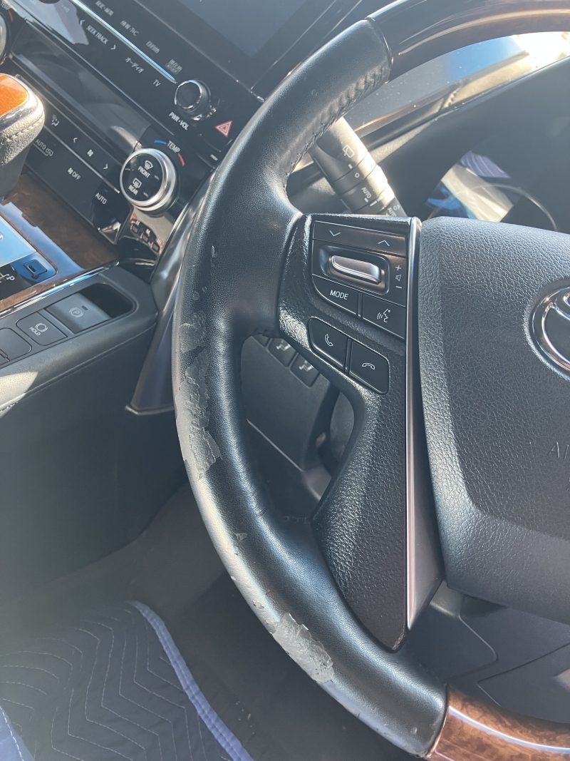 トヨタ車バイキャストレザーのハンドル剥がれです。最近のトヨタ車で似たような剥がれが多いような気がします。クリーニング時点で表皮がぺりぺりと剥がれだすとかなり劣化している状態です。施工後はきれいに仕上がっていますが、施工後の耐久性は下地の劣化状況次第と思われます。丁寧にご使用になればある程度は大丈夫と思います。ご依頼ありがとうございました。