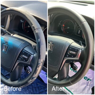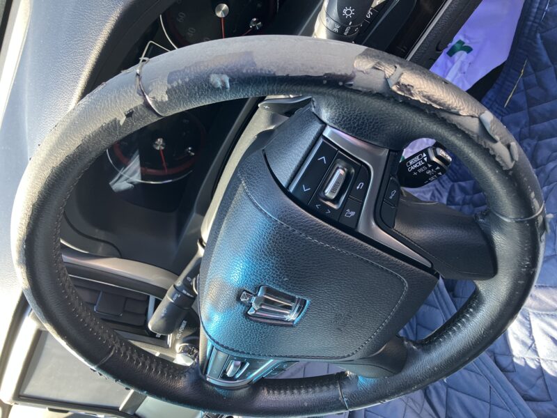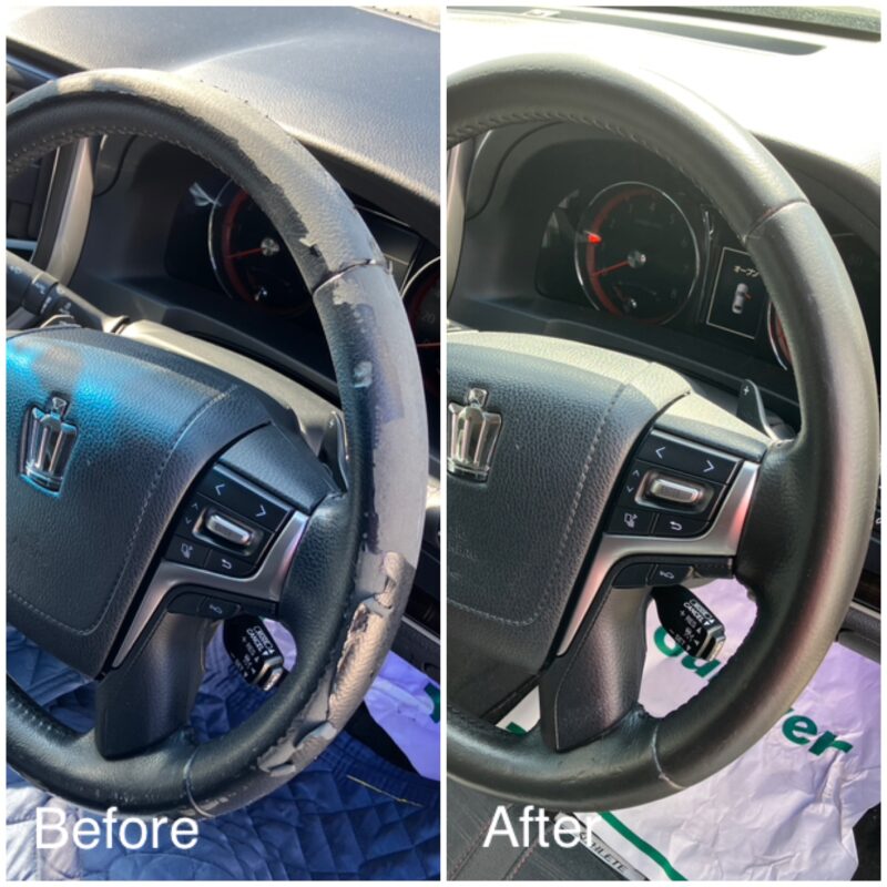 クラウンのハンドル表皮がほぼほぼ剝がれかけていました。日光や紫外線、手汗などの影響により、表皮が剝がれてくることがよくあります。本革仕様ではなく、バイキャストレザーといういわゆる合皮仕様の革の場合に表皮が剥がれてしまうことがあるようです。写真のような状態ですと、潔くすべての表皮を剝がしてから、革用塗装を行うことがよいと判断しました。少し前処理に時間がかかり、仕上がりが新品のようにはなりませんが、綺麗にできたと思います。ご依頼ありがとうございました。