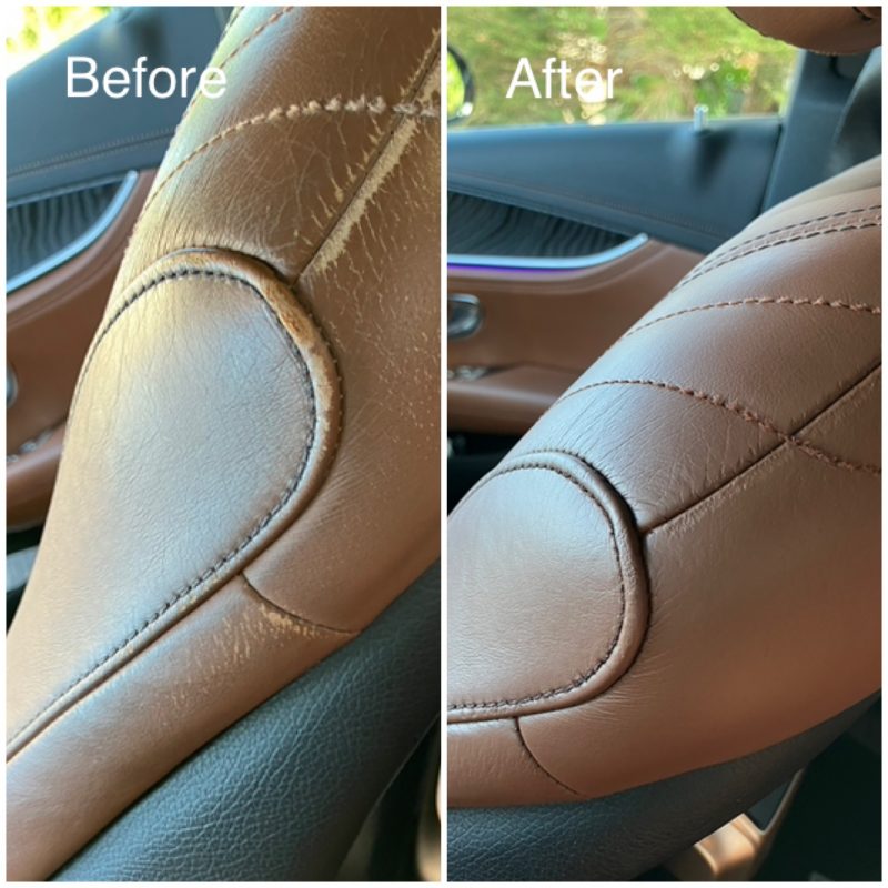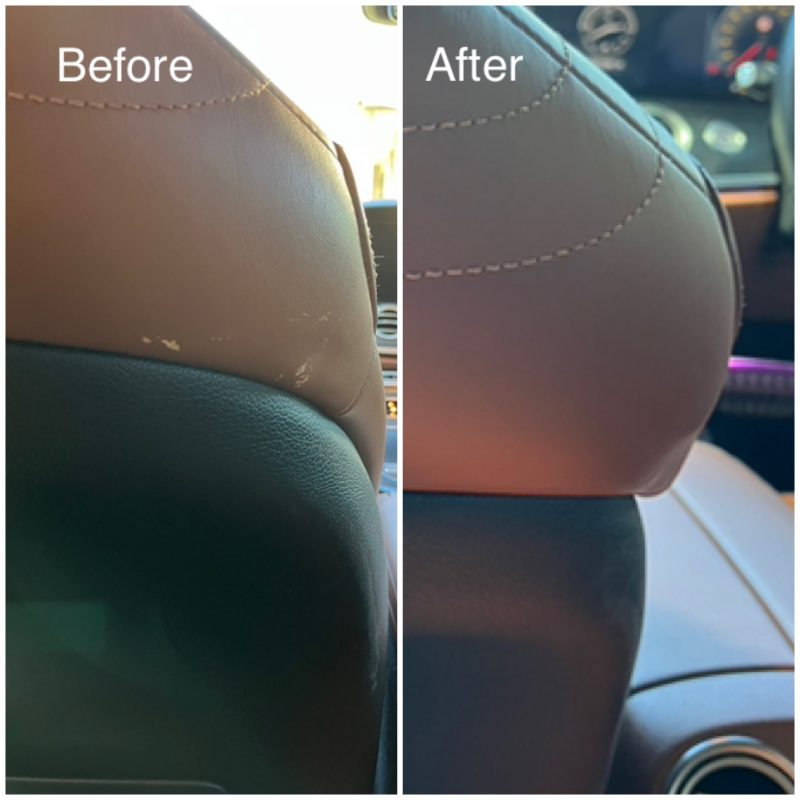 ベンツレザーシートのひっかき傷のような穴がありました。綺麗なタン色のレザーですので、小さな傷ではありますが目立つとのことでご依頼を頂きました。きちんと穴を埋めて均した後、革専用の塗料で塗装しました。綺麗になってよかったです。ご依頼ありがとうございました。