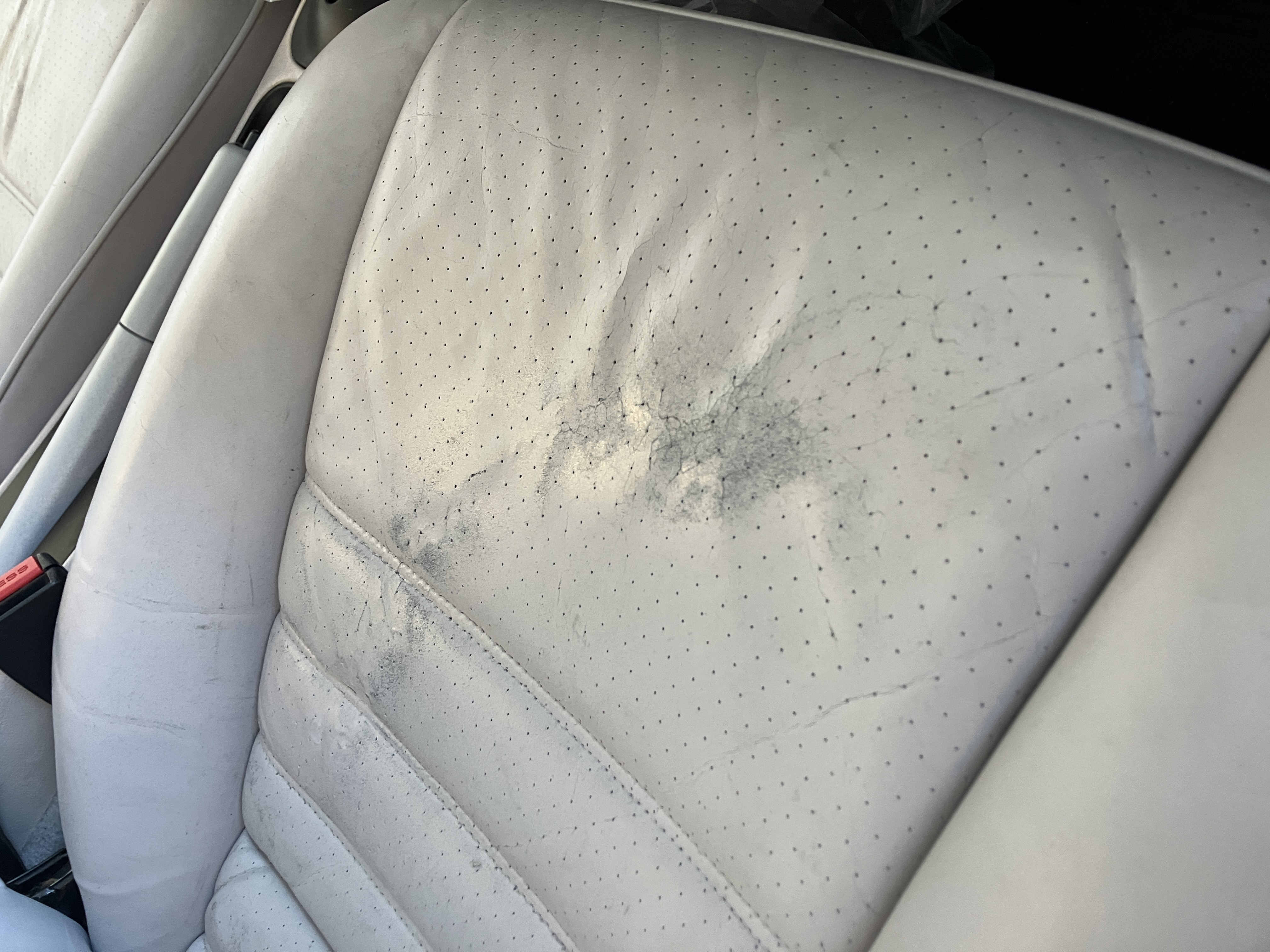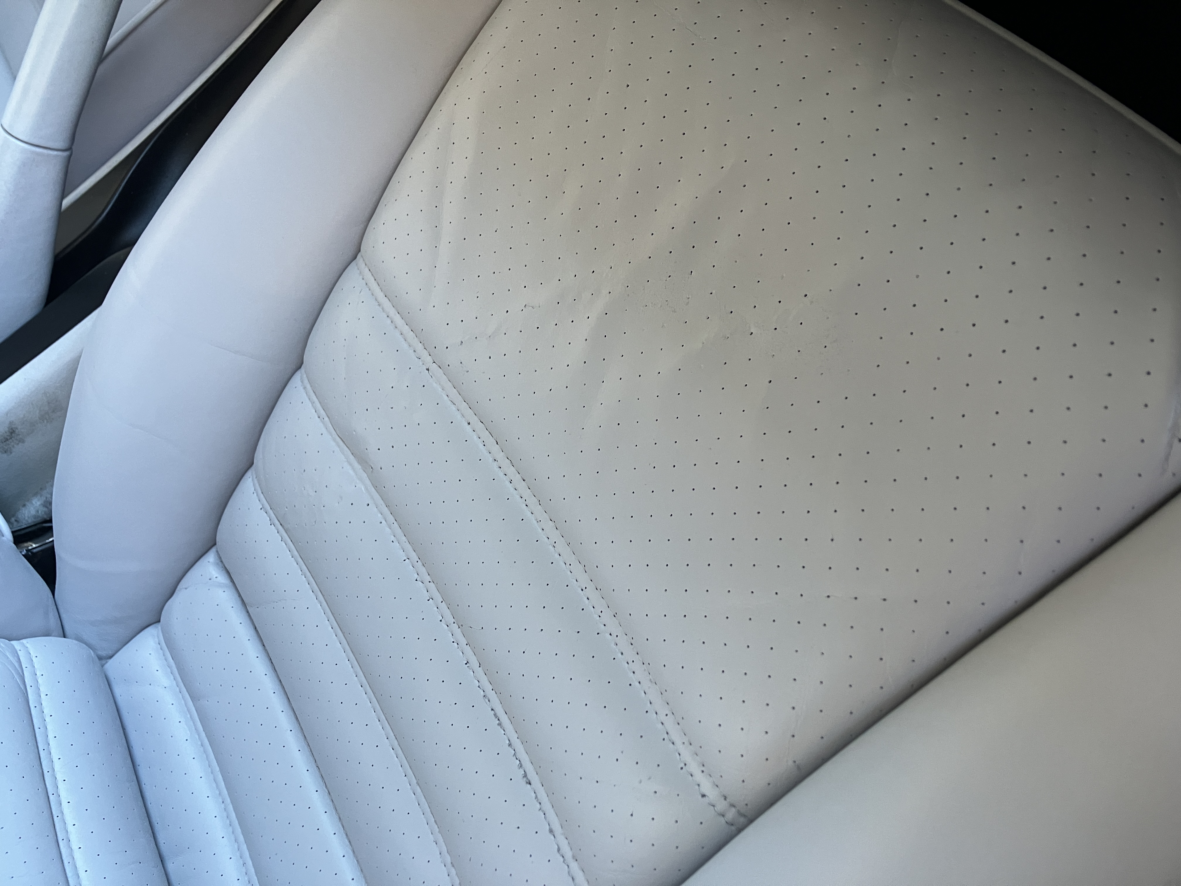 かなり古いポルシェカレラ2の本革シート補修です。座面がパンチング穴仕様で、穴と穴ががつながってひび割れとなり、経日劣化とともにたくさんのひび割れが生じておりました。このひび割れ自体はどうしようもなかったのですが、なるべく塗膜をひび割れ内に擦り込み、見た目はかなり回復したと思います。(物理的にはひび割れの進行を防止するレベルの塗膜にはなっていませんので、事前にご了承をいただいた上での施工となりました。)見た目がかなり良くなって、ご満足いただけたようで当方もうれしいです。ご依頼ありがとうございました。