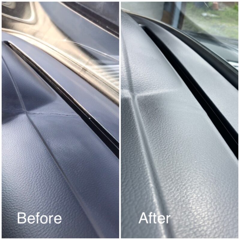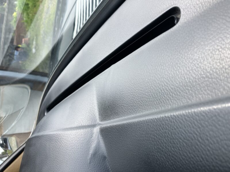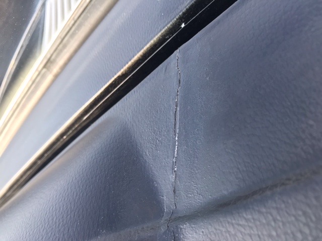 旧車のダッシュボード割れです。以前に何かで補修されておりまして、割れの間に何か充填されていました。今回はこれを除去することなく、上から接着剤を充填して平面に均してから塗装し綺麗に仕上がったのですが、午後の直射日光を浴びる時間になると、塗膜が微妙にひび割れしてしまいます。おそらくですが、ダッシュボードの温度が上がると、ひび割れが微妙に伸縮して動くのだと思います。何度か修正しましたが、残念ながらこれ以上の仕上がりは難しく、お客様に説明してご了承を頂きました。遠方からのご依頼ありがとうございました。