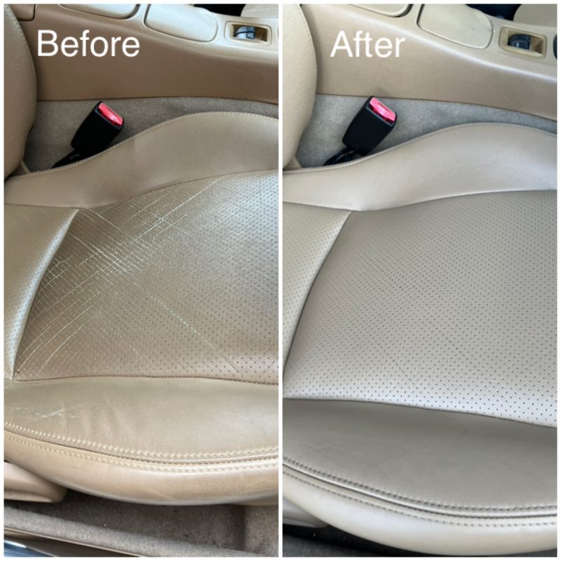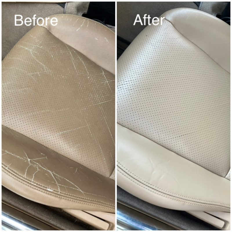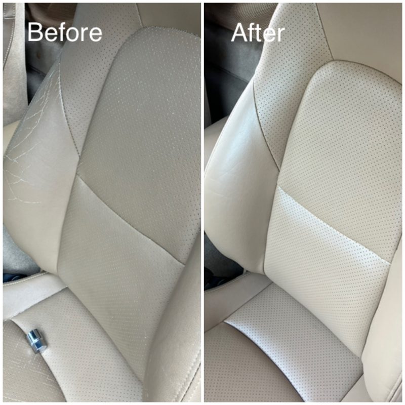 24年選手のNDロードスター、本革シートのひび割れ補修です。年数の割にはまだ程度は良いと思いますが、乾燥と経日劣化により、ひび割れが深く大きくなっていました。まだ破れていなかったことは幸いです。ひび割れの角が無くなるまで削り、パテ埋めして革専用塗装しました。若干の歪みは残りますが、見た目はかなりきれいになりました。パンチングの穴が連結してひび割れになっていますが、これは如何ともしがたく、ひび割れが進行しにくいように革専用塗装をしました。仕上がりがかなりきれいになって、お褒め頂きました。ご依頼ありがとうございました。