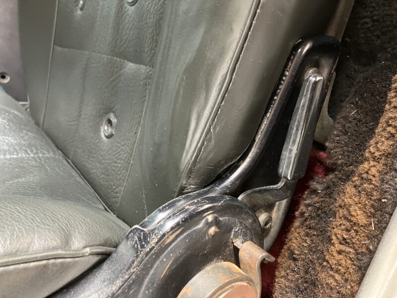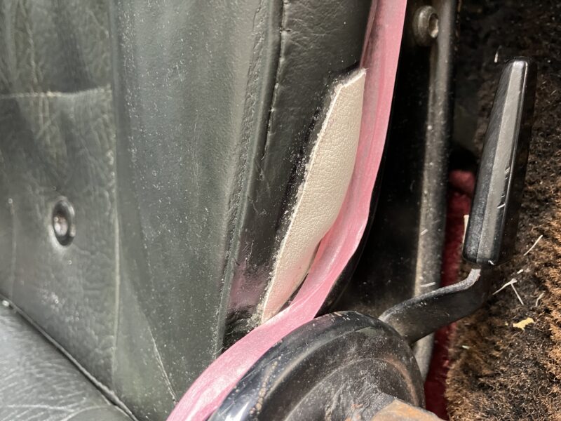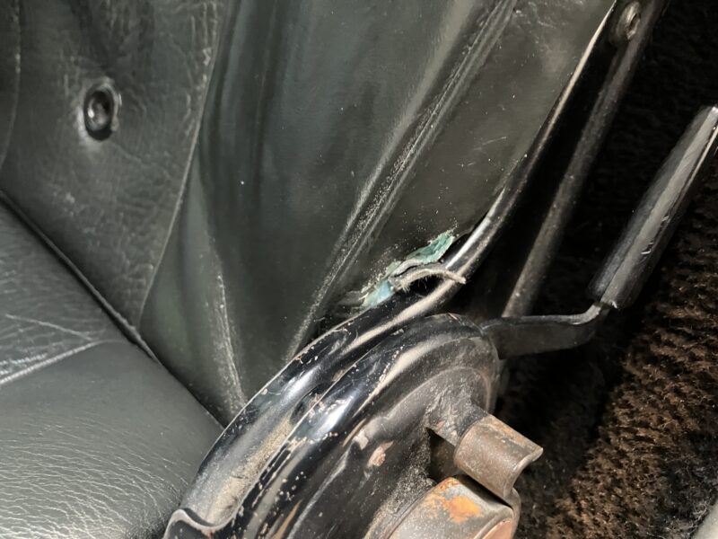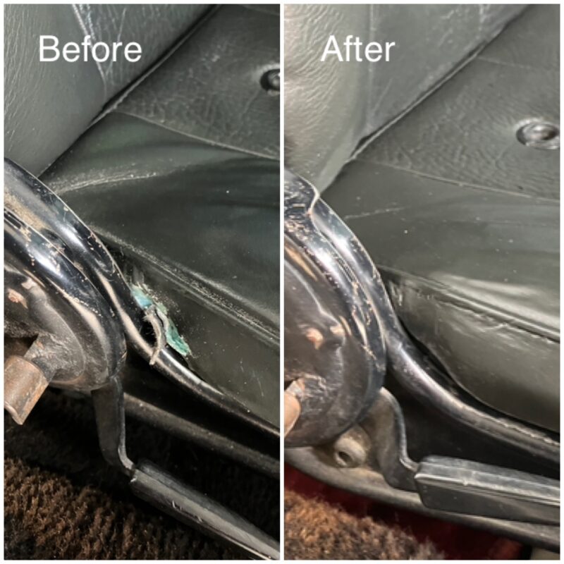 旧車ギャランGTO本革シートの裂け補修です。座面と背もたれ結合部の金具に擦れている革が破れていました。体重がかかり金具で降り曲がり擦れて破れるという非常に過酷な状態にあるようです。革自体も経年で硬化しているので、単にパテでつなぐだけでは再発すると思い、破れた部分の裏地と表側に大きめの充て布をして曲げや擦れに耐えれるように強化しました。あとは充て布の段差をパテで埋めて均し、革専用塗装して仕上がりです。見た目よりも耐久性重視で仕上げました。まだまだお楽しみくださいませ。