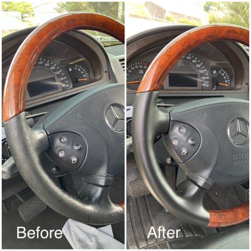 ベンツの本革巻ハンドルのひび割れ劣化です。おそらく乾燥や日光による経時劣化でカサカサひび割れが生じた状態です。本革の表皮を削ってひび割れが除去できたので、ひび割れ専用のパテ埋めは必要はありませんでした。さすがベンツの革素材はいいものを使っていますね。多分生地の厚みが結構あったからかもしれません。最後に革専用の液状パテをオリジナル色に調色してスプレーガン塗装し、シボ付けして仕上がりです。新品みたいと仰って頂きありがとうございました。