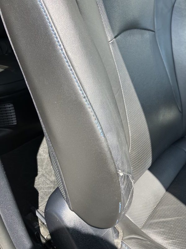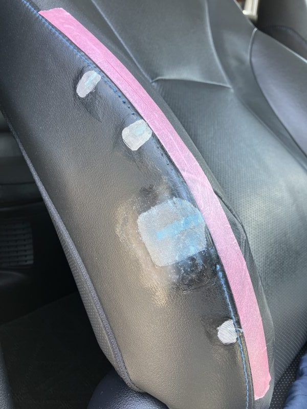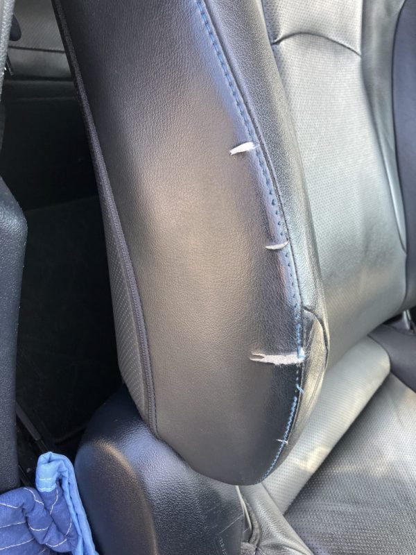 プリウス運転席のレザーシート破れです。経年劣化と乗降りの荷重で擦れて、更に裂けてしまったという症状です。ステッチの部分まで裂けていましたので、耐久性を考えて一部ステッチ自体をパテで埋めて強度を保つことにしました。ステッチがないという見栄えの問題はありますが、乗降りの荷重対策としては良いと思います。ご依頼ありがとうございました。