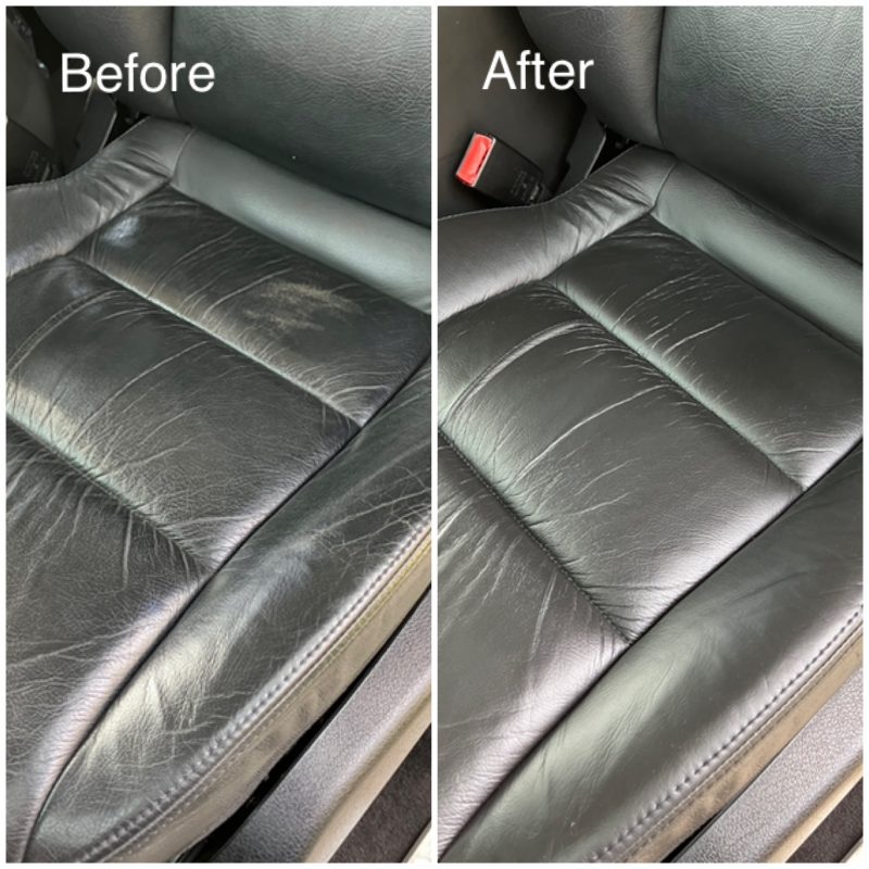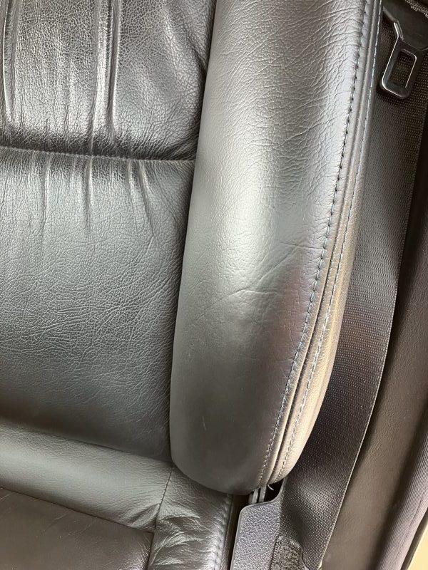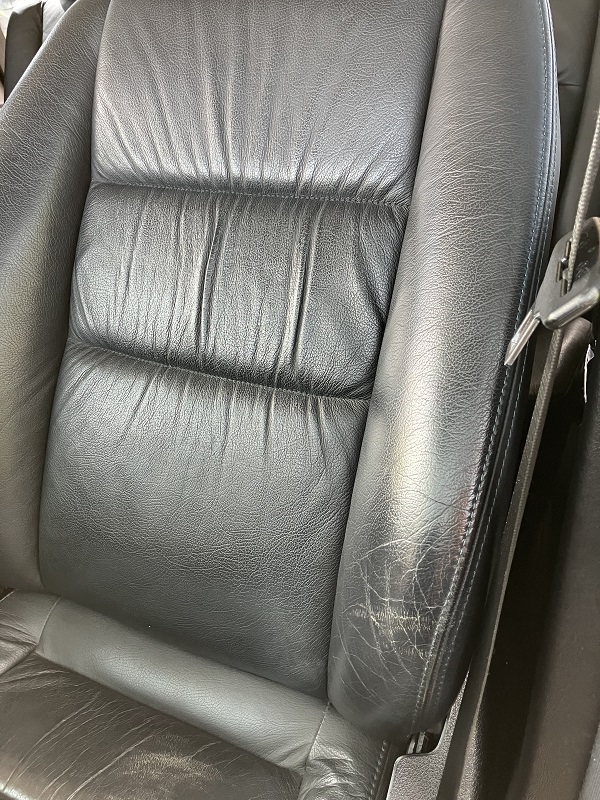 本革のシートが擦れて白くなっていました。運転席の乗降り側のため、どうしても荷重がかかって擦れてしまいます。放っておくと更に擦れが大きくなり、ひび割れにつながっていきますので、今回のようなお早目の補修が好ましいです。若干のシワも埋めながら、革専用の塗装をさせて頂きました。ありがとうございました。