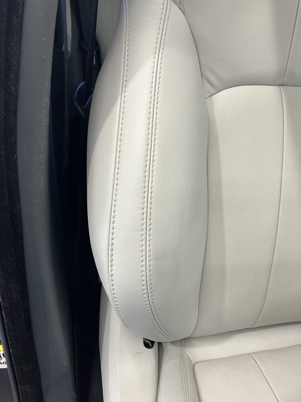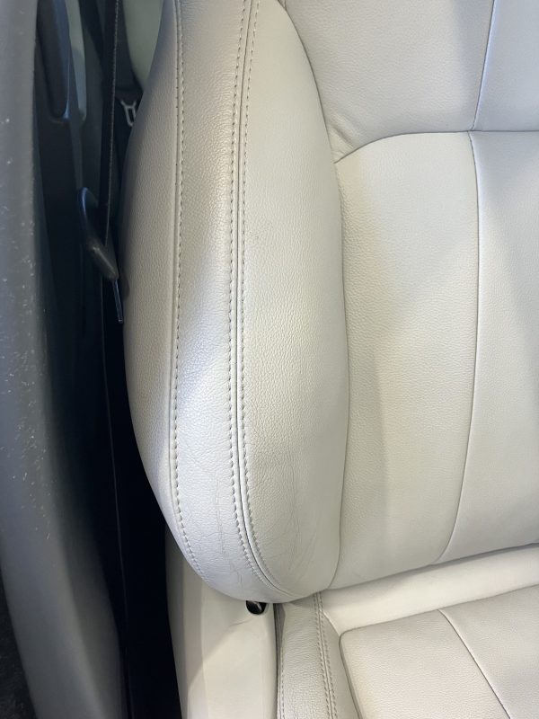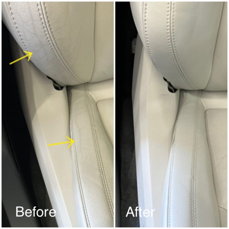 Range Rover Evoque本革シートの皺です。劣化というよりは、通常に使用した際にできた「小皺」を補修させていただきました。やっぱり綺麗なシートで乗りたいということで、シート背もたれと座面のホールド面にできた皺をパテで埋めて、革専用塗料で塗装しました。周囲と同じ綺麗なビスク色に仕上がりました。今回施主様のご都合で、オートバックス様のピット内で作業させていただきました。非常に涼しい環境をお借りでき、作業も捗りました。施主様、オートバックス様、本当にありがとうございました。