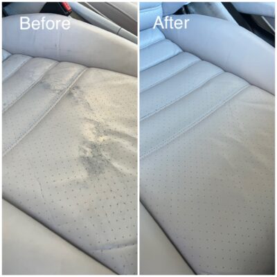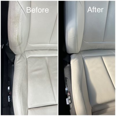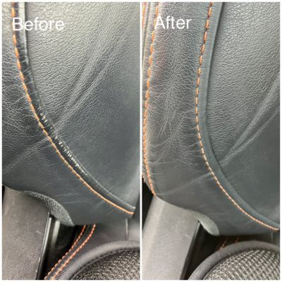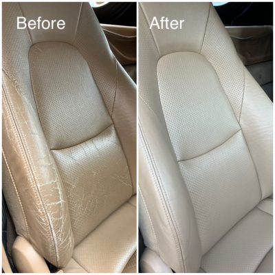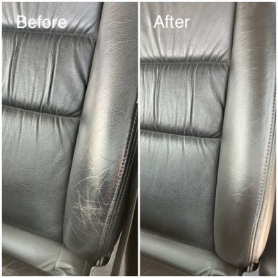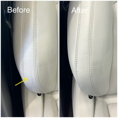 本革のシートが擦れて白くなっていました。運転席の乗降り側のため、どうしても荷重がかかって擦れてしまいます。放っておくと更に擦れが大きくなり、ひび割れにつながっていきますので、今回のようなお早目の補修が好ましいです。若干のシワも埋めながら、革専用の塗装をさせて頂きました。ありがとうございました。