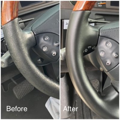 ベンツの本革巻ハンドルのひび割れ劣化です。おそらく乾燥や日光による経時劣化でカサカサひび割れが生じた状態です。本革の表皮を削ってひび割れが除去できたので、ひび割れ専用のパテ埋めは必要はありませんでした。さすがベンツの革素材はいいものを使っていますね。多分生地の厚みが結構あったからかもしれません。最後に革専用の液状パテをオリジナル色に調色してスプレーガン塗装し、シボ付けして仕上がりです。新品みたいと仰って頂きありがとうございました。