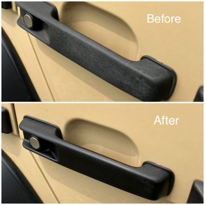 ベンツの未塗装樹脂のドアノブが経時変化で白くなっていました。塗装する手段もあるのですが、安価に仕上げるために黒色に戻るコーティング剤を塗布しました。新品みたいな黒色ではないですが、白い状態よりは全然見栄えが良くなりました。ご依頼ありがとうございました。