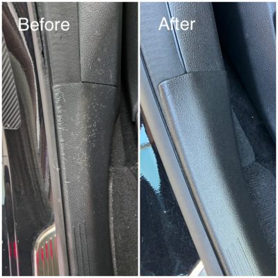 ベンツ運転席側シート横のシューズガード(正式名称は知りません。プラスチック製)の傷補修です。おそらくシートベルトの金属バックルが当たってできた傷で、広く細かくついていました。ですので、施工後も同様に傷が入る可能性が高いという前提にはなりますが、施工させていただきました。中古車で購入された個人様からのご依頼で、他の内装は非常にきれいなのに、ここだけ傷だらけで気になるとのこと。仕上がりをお褒め頂きありがとうございます。