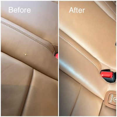 ベンツレザーシートのひっかき傷のような穴がありました。綺麗なタン色のレザーですので、小さな傷ではありますが目立つとのことでご依頼を頂きました。きちんと穴を埋めて均した後、革専用の塗料で塗装しました。綺麗になってよかったです。ご依頼ありがとうございました。