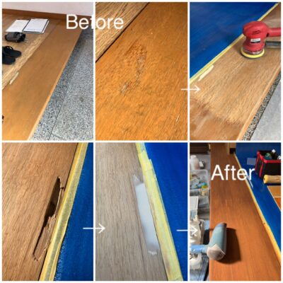 リフォーム宅の玄関框補修です。ところどころ色褪せやひび割れがあり、框中央に古い補修跡がありました。補修跡は穴埋めされてはいましたが、なぜか塗装されておらず、お客様が非常に気にしておられました。表面の塗膜を研磨して除去し、古い補修跡も除去したところ、深さが5cmほどあり、なぜこれほど深いのか不思議でしたが、エポキシ樹脂をしっかり充填し、踏んでも支障がないように補強してからパテ埋めしました。根気よくパテの上を顔料で塗装して、周囲は木目を綺麗に残したいためステイン塗装しました。最後に、框として耐久性を持たすように2液ウレタンにてコーティングして終了です。綺麗に仕上がりよかったです。