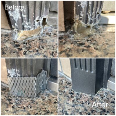 リフォーム宅にて、玄関ドアのアルミ支柱の根元が腐食していました。腐食は、どうみても下から腐食が始まっており、土台である石が、おそらく土中の水分等の影響で砂化してボロボロの状態でした。本来ならば支柱含めた玄関全体の取替が好ましいと思い、当方では応急処置的な補修(耐久性や強度等は保証できない)の対応のみ可能と提案しましたが、それで大丈夫とのことで施工しました。砂化した石をできるだけ除去し、下からの水侵入をなるべく防ぐようにエポキシ樹脂を充填し、支柱表面に手製のアルミ枠を張り付け、その上からパテ成形、塗装を行いました。ぱっと見で極端な違和感がなく、仕上がりにご満足をいただけました。悩みながらの施工でしたが、ご評価いただき嬉しい限りです。