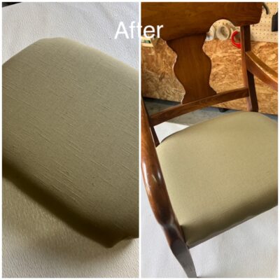 古い椅子のスポンジと布地がぼろぼろになっており、下地の板を残してすべて張り替えました。板は少しカビが生じていたので、研磨とカビ取り剤で綺麗にしてから新しいクッションを貼り付けました。表面の生地はお客様の好みでご指定です。家を新築してリビングに置きたいとのことで、部屋の雰囲気に合わせた和風のいい色です。以前に施工した長椅子と、今回の単椅子3脚で張り替え完成です。まだまだ長くご使用ください。ご依頼ありがとうございました。